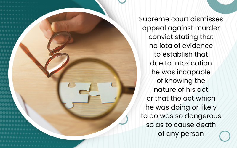 Supreme court dismisses appeal against murder convict stating that no iota of evidence to establish that due to intoxication he was incapable of knowing the nature of his act or that the act which he was doing or likely to do was so dangerous so as to cause death of any person