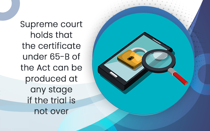 Supreme court holds that the certificate under 65-B of the Act can be produced at any stage if the trial is not over